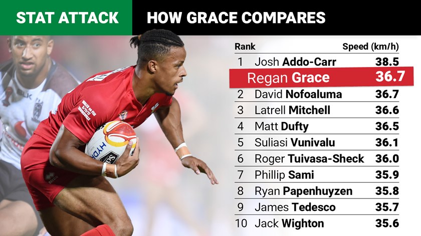 Grace was clocked at a rapid 36.7 km/hr "with ball in-hand" during a game against Hull KR, speed which only Addo-Carr has trumped over the past two years in the NRL.