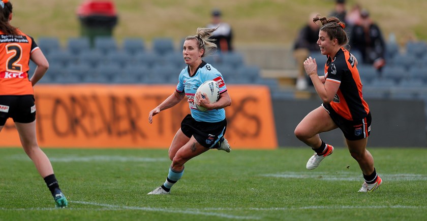The defence was equally as impressive from both sides. Wests Tigers five-eighth Losana Lutu showed great desperation to chase down Sharks winger Teagan Berry and ankle tap her from behind to snuff out a dangerous break down the sideline.