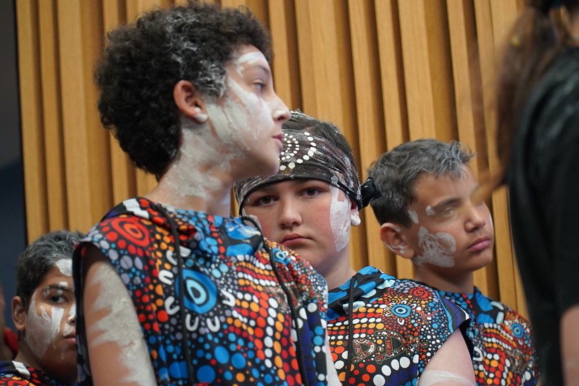 Dunn, other elders and students from his ‘Get Black On Ya Feet’ cultural and education program, performed traditional dances to celebrate country and explain the essence of the painting depicting communities coming from north, south, east and west who meet at the NSWRL.